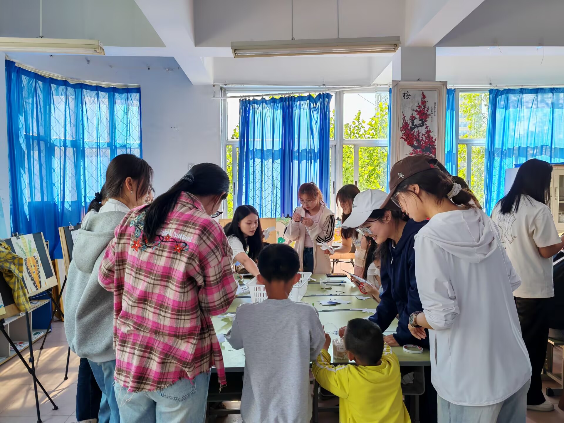 随后,志愿者们与孩子们携手开启手工创作之旅。大家围坐在一起,耐心指导孩子们用纸杯制作风车,并在风车上绘制各种图案。一件件作品承载着孩子们天马行空的想象,也记录着志愿者与孩子们共同协作的美好瞬间。在互动中,孩子们逐渐放下防备,主动与志愿者交流,现场笑声不断。
