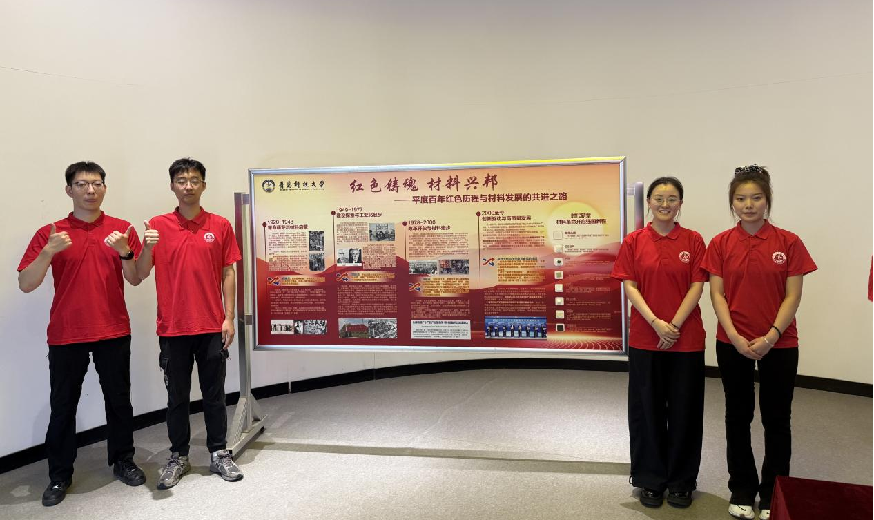 图一:"橡"尚青年实践团在平度党史馆展示"红色基因与材料科学"主题展板
