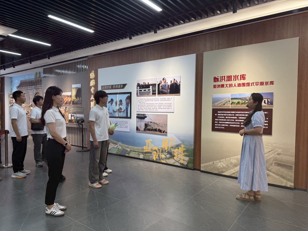 实践团首站抵达东毛家庄村独具特色的棘洪滩水库文化展厅。该村依托毗邻引黄济青工程核心——棘洪滩水库的地缘优势,精心打造了集科普教育、文化交流、休闲体验于一体的文化空间。在讲解员引导下,队员们通过一件件承载历史的老物件、一幅幅记录变迁的珍贵图片和一处处还原生活的实景展示,深刻了解了棘洪滩水库的建设历程、周边社区的民俗乡风以及水源地文化的深厚底蕴。尤为震撼的是沉浸式三维动画演绎的筑坝场景和投影展示,让队员们仿佛穿越时空,亲历了那段艰苦卓绝的奋斗岁月,更让他们深刻感知到今日幸福生活的来之不易,极大地激发了守护绿水青山、传承奋斗精神的责任意识。