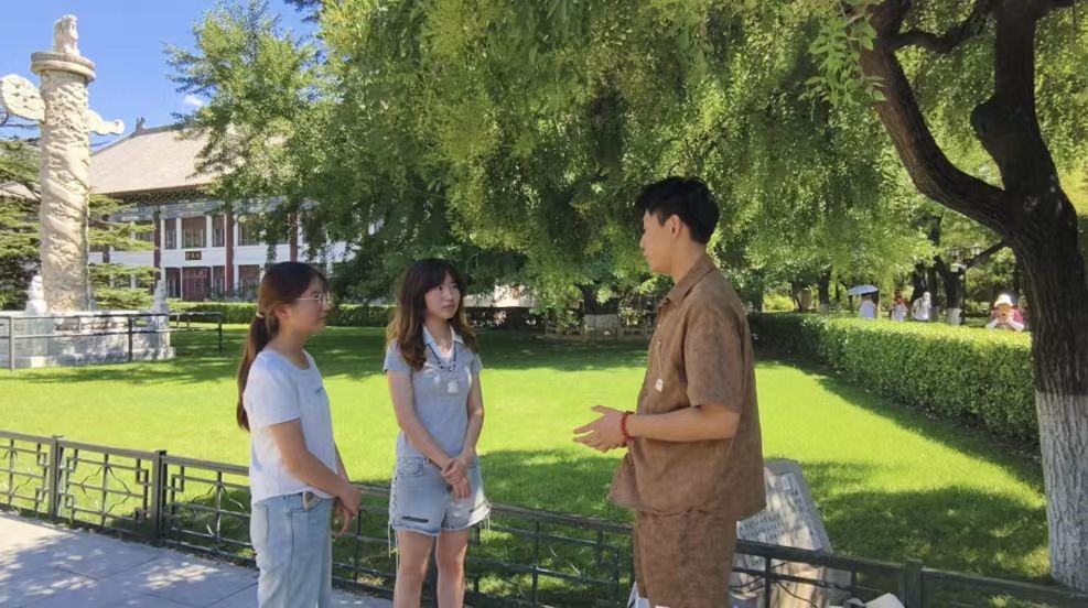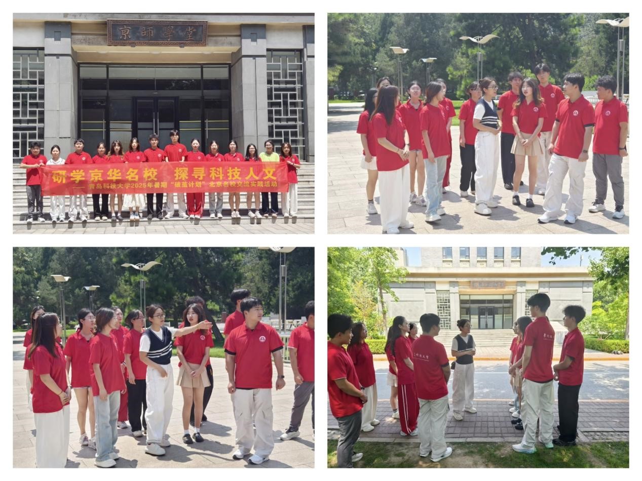 北师大校园内,化学院2009级校友、北京师范大学化学院教师沈晓彤在“木铎金声”雕塑前迎接团队。她阐释木铎象征“教育使命”,链接北师大育人理念与青科大“明德、笃学、弘毅、拓新”校训的精神共鸣。漫步至京师学堂,沈晓彤回溯这座见证中国师范教育史的殿堂,并分享从学生到教师的转型感悟。谈及治学根本,她以建筑为喻强调:“基础如砖瓦,务必扎实,方能筑起学术高楼。” 临别合影时,她笑言:“从青科大到北师大,身份虽变,对化学的热忱与成长追求永存。愿你们持此初心,坚定前行。” 木铎金声与师者情怀,在成员心中烙下“传承”印记。