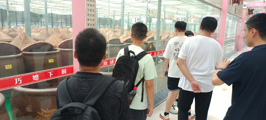 在酱油厂负责人的带领下,实践团成员们先后参观了原料仓库、发酵车间、晒场等生产区域。在原料仓库,饱满的黄豆、小麦等原料整齐堆放,负责人介绍,巧媳妇酱油坚持选用优质非转基因大豆和天然原料,从源头保证产品品质。进入发酵车间,一排排古朴的酱缸映入眼帘,缸内的酱料在时间的沉淀下散发着独特的香气。“这些酱缸已经有几十年的历史了,古法酿造讲究‘日晒夜露’,依靠自然的力量让原料充分发酵,这个过程少则数月,多则数年。”负责人的讲解让同学们对古法工艺的耐心与坚守有了深刻认识。