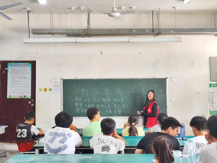 职业生涯规划课上,黑板上“农民、工人、医生、教师”等职业词引发热烈讨论。志愿者结合自身经历分享“大学专业怎么选”“不同职业的日常”,启发孩子思考“未来想成为什么样的人”,为乡村孩子的职业认知埋下探索的种子。