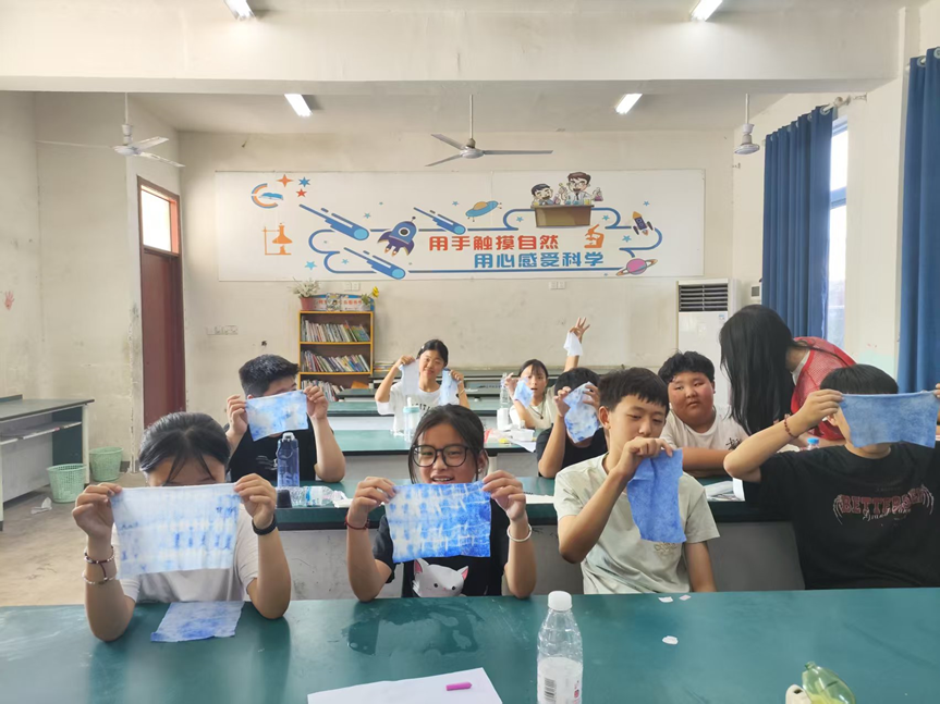 扎染课则让孩子触摸传统工艺的温度。志愿者站在屏幕前,讲解“扎染是传统民族艺术的瑰宝”(如图5),随后指导孩子将白布折叠、捆绑,浸入染料。当蓝白相间的纹样在布料上晕染开来,孩子们兴奋地举起作品(如图6),“原来白布能变这么好看!”