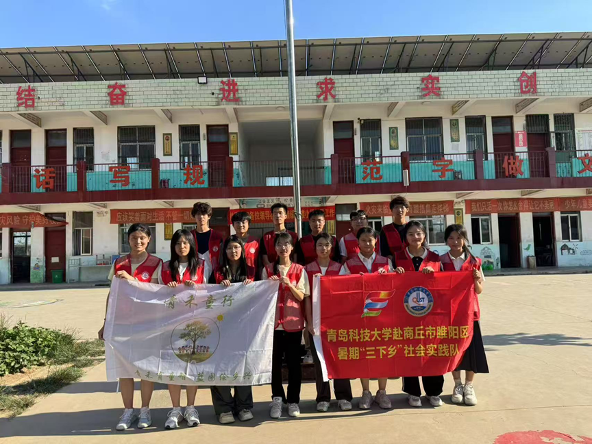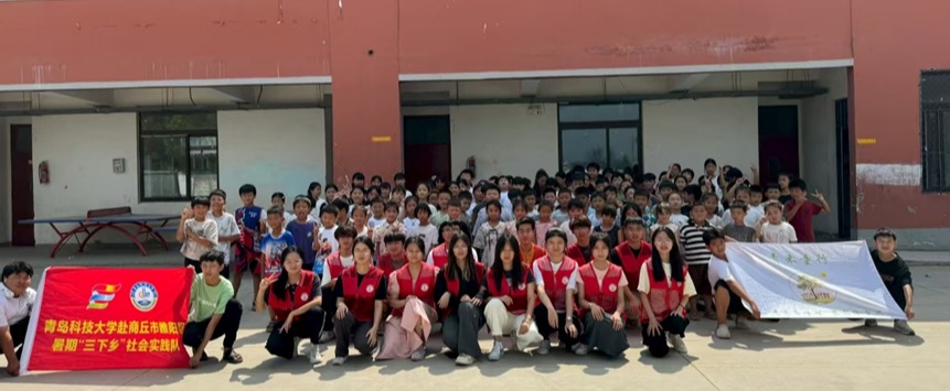 离别之际,支教团与全体学生在教学楼前合影。红色旗帜上“766全讯白菜网赴商丘市睢阳区暑期‘三下乡’社会实践队”的字样格外醒目,孩子们簇拥着志愿者,镜头定格下这段夏日里的温暖记忆。