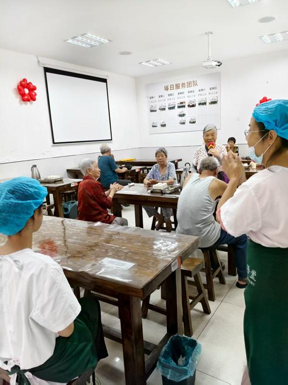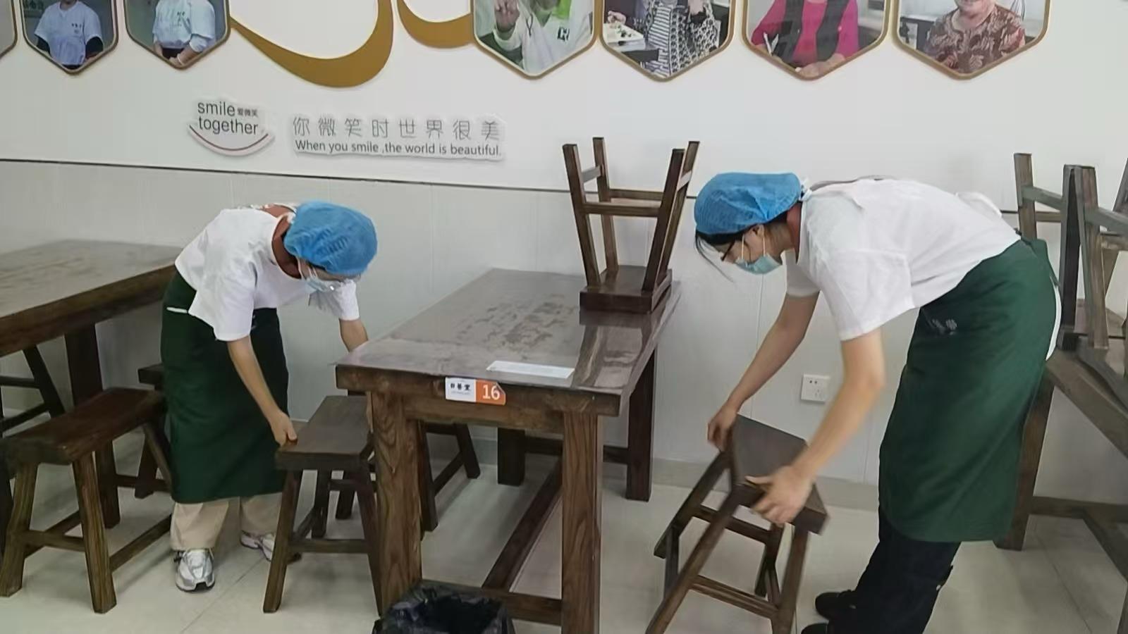 与此同时,另一部分成员全力营造整洁环境。他们清扫角落、擦拭桌椅、规整餐具,让日善堂的每一处都洁净如新。干净的环境不仅是对老人的尊重,更体现志愿服务中“细节见真情”的理念,为老人们打造出舒适的用餐空间,让温暖从环境延伸到心间。