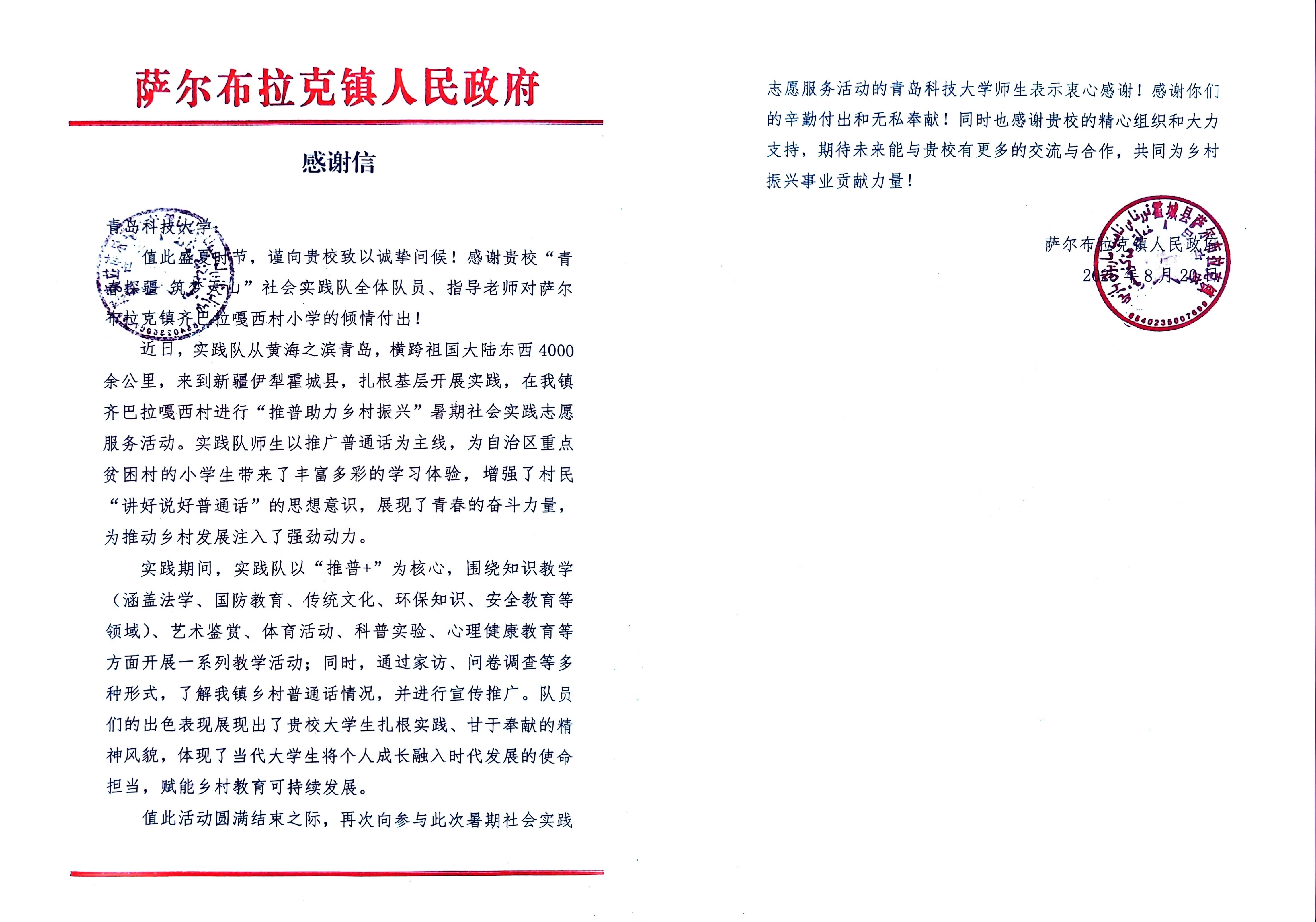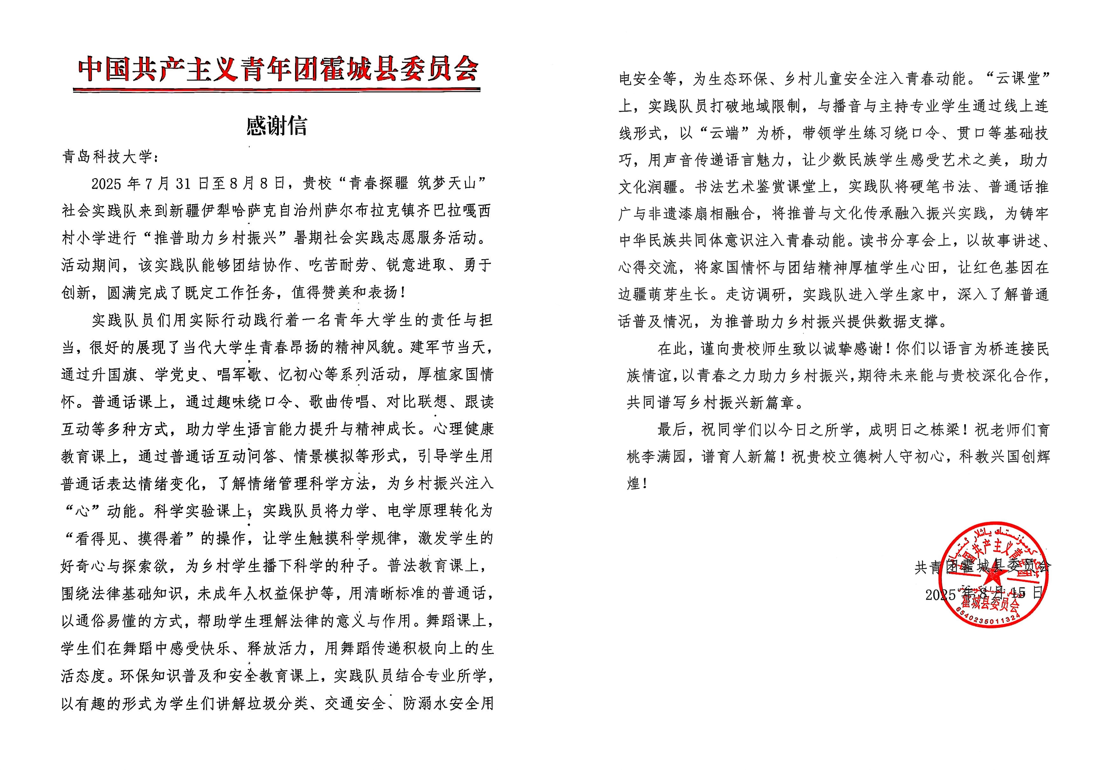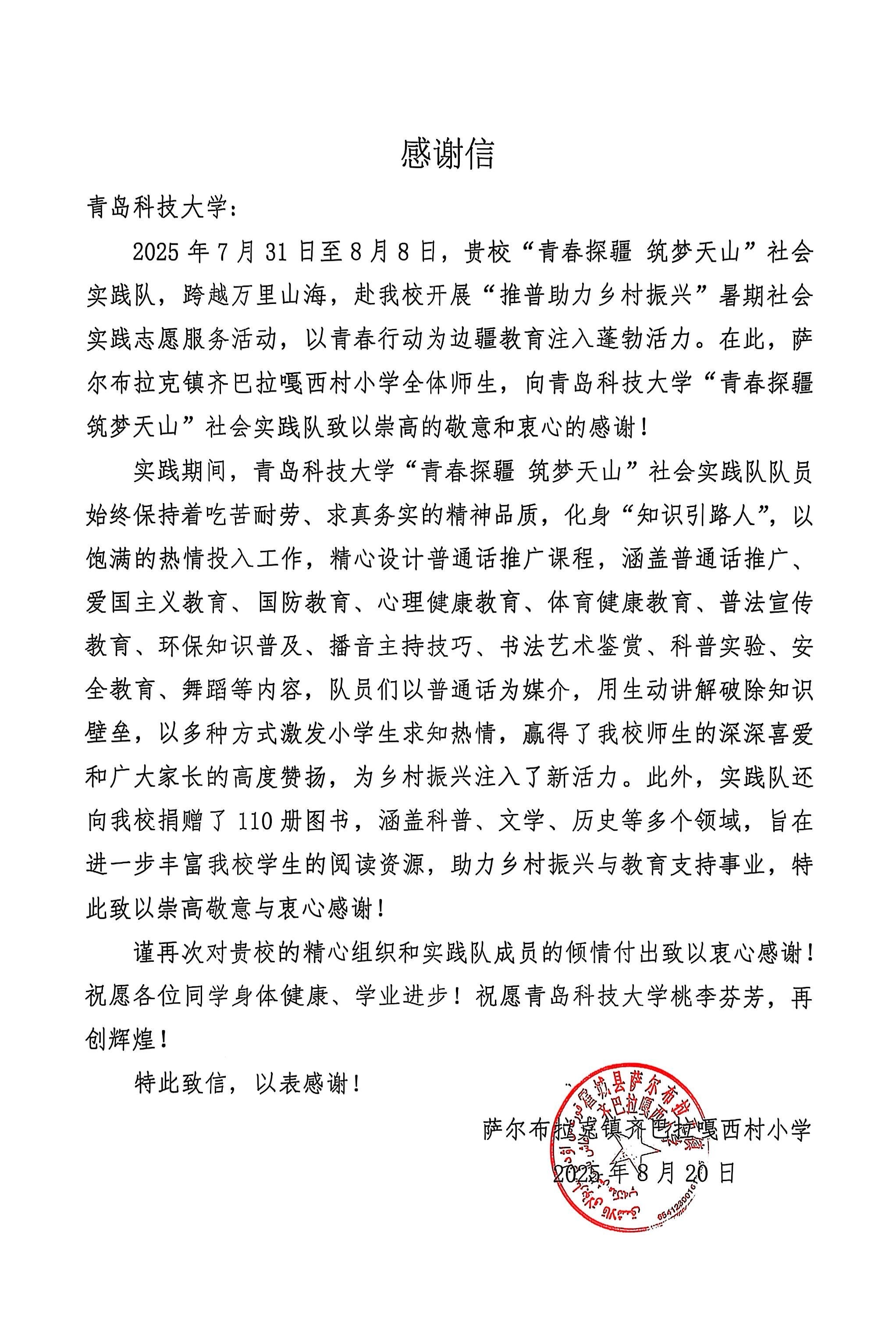 近日,环境学院“青春探疆 筑梦天山”社会实践队收到共青团霍城县委员会、萨尔布拉克镇人民政府、齐巴拉嘎西村小学发来的感谢信,对该实践队在暑期“三下乡”社会实践中的出色表现给予高度赞扬。信中称赞实践队“以语言为桥连接民族情谊,以青春之力助力乡村振兴”,他们用实际行动诠释了青年大学生的责任与担当,充分展现出当代大学生青春昂扬、积极向上的精神风貌,为当地的发展注入了青春活力。